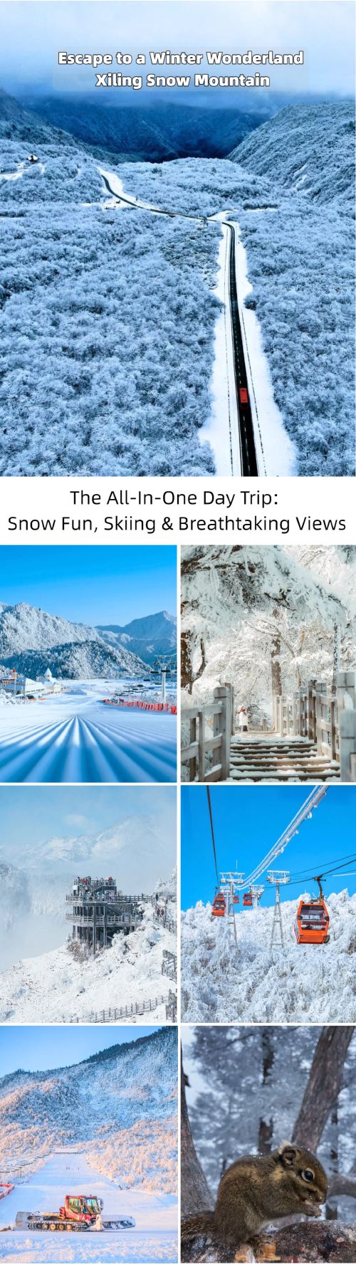 - Dual Snow Experiences: Dive into the lively Yingxue Plaza for snowman-building, photo ops with colorful winter architecture, and amusement rides, then ascend to the summit via cable car to stroll a scenic boardwalk with breathtaking panoramic views and even playful squirrels.